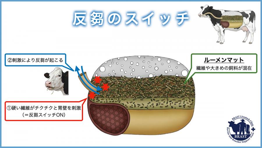 牛の反芻は第一胃で餌が胃壁をチクチクと刺激することでスイッチが入ります。これはルーメンマットをいかに形成していくかということにもつながります。