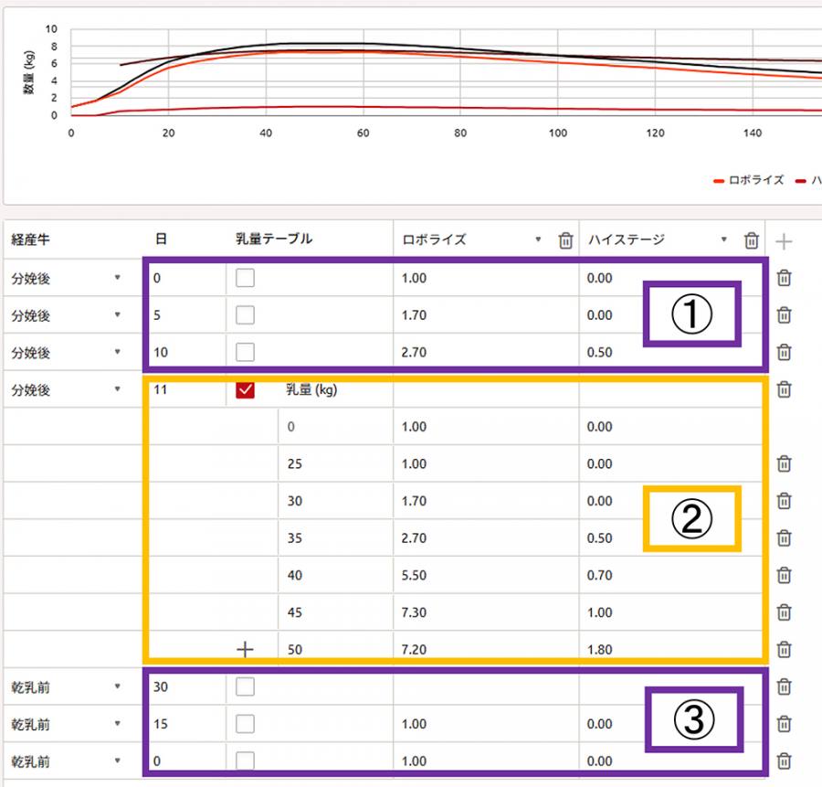 搾乳ロボットでは、泌乳期に応じた給餌設定(泌乳期連動テーブル)と乳量に応じた給餌設定(乳量連動テーブル)の2つを組み合わせて給餌設定をすることが出来ます。画像の中では、①と③が泌乳期に応じた給与設定、②が乳量に応じた給与設定になっています。
