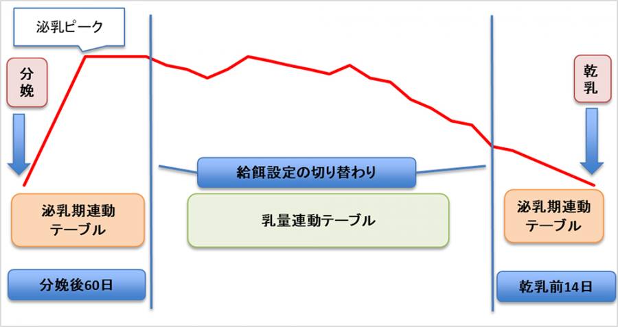 ・分娩後60日~乾乳前14日:乳量連動テーブルを用いて、各個体の乳量に応じた給餌
