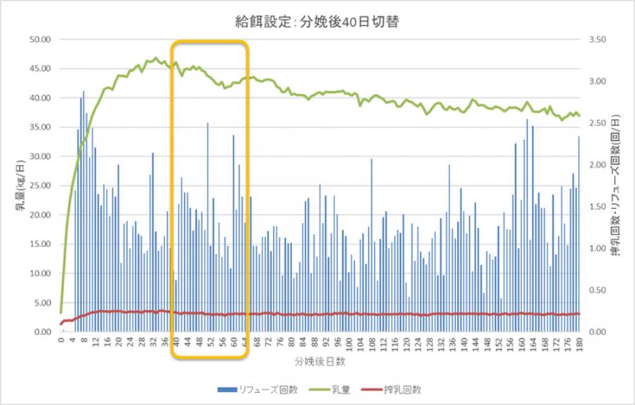 分娩後40日以降の日乳量の漸減やリフューズ回数の増加は、エネルギー不足によるものであり、牛自体もエネルギーが欲しくなり、ロボットから排出される配合を求めてリフューズ回数が多くなっているのでは?と考え、給餌設定の変更時期を分娩後40日から分娩後60日に変更してみました。