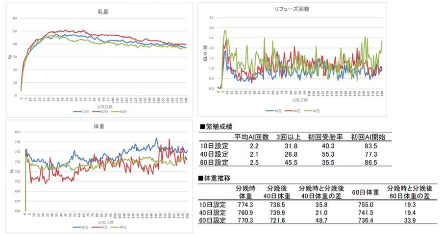 分娩後40日、60日、10日で給餌設定を切り替えた時の繁殖成績を確認すると、平均AI回数、授精回数3回以上の割合、初回受胎率、初回AI開始日数は、すべて分娩後40日設定>10日設定>60日設定の順で良好な成績となっていました。
