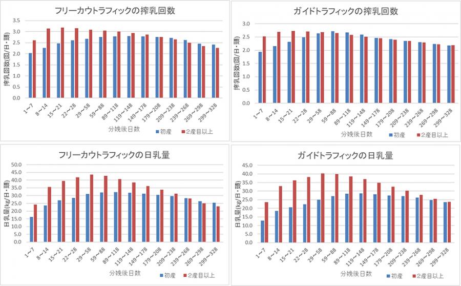 搾乳ロボットにおける初産牛と2産目以上の牛の乳量と搾乳ロボットへの訪問回数をまとめた報告(J.M. Siewertら(2018))では、フリーカウトラフィック、ガイドトラフィックともに、2産目以上の牛よりも初産牛は日乳量や搾乳回数、リフューズ回数が少なくなっていました。